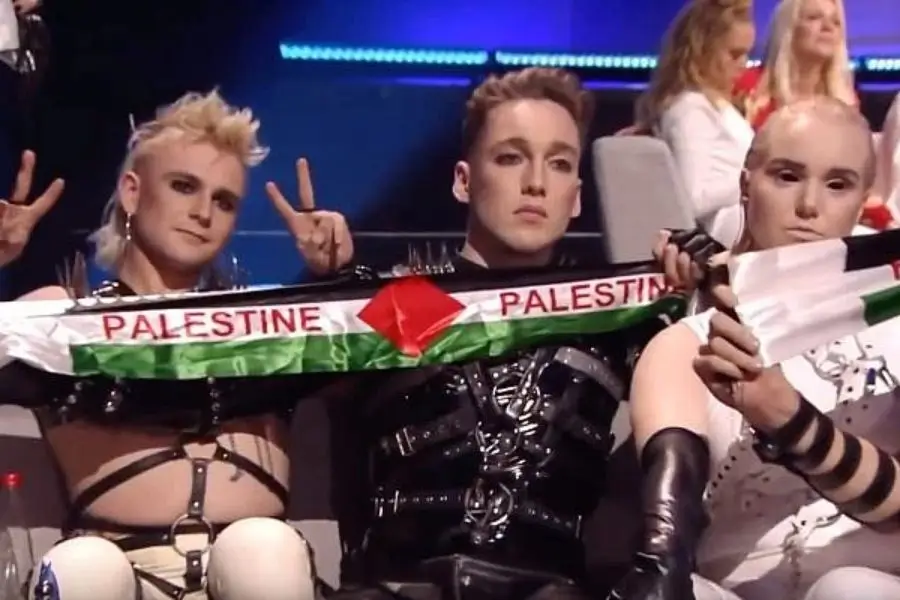 Icelandic band Hatari hold up Palestinian flags during the live grand final of the Eurovision in Tel Aviv, May 19, 2019 – Credit: Screenshot/YouTube