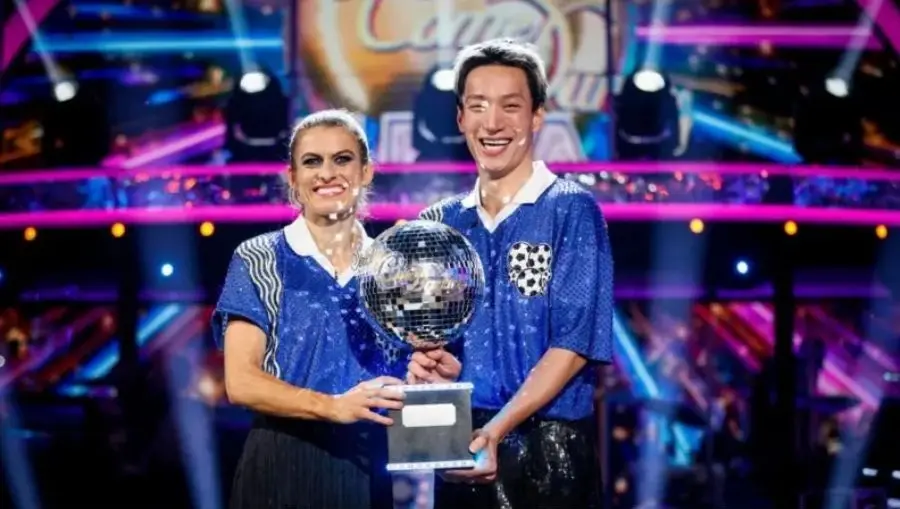 Karen Carney and Carlos Gu celebrate with the glitterball trophy after their football-themed jive to One Way Or Another by Blondie earned a standing ovation. Credit: BBC